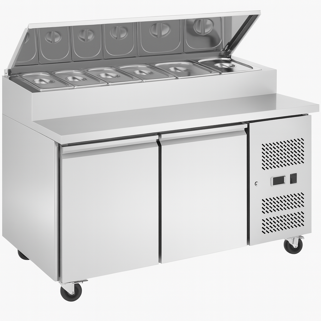 The AA Catering SH‑2000/800 2‑Door Pizza Prep Counter is built for reliable commercial performance, offering a 390L capacity within a durable 304 stainless‑steel foamed cabinet. It runs on an Embraco EM2X3125U compressor (220V/50Hz) with efficient R290 refrigerant, while a Carel digital thermostat maintains a precise –2°C to 8°C chiller range.
