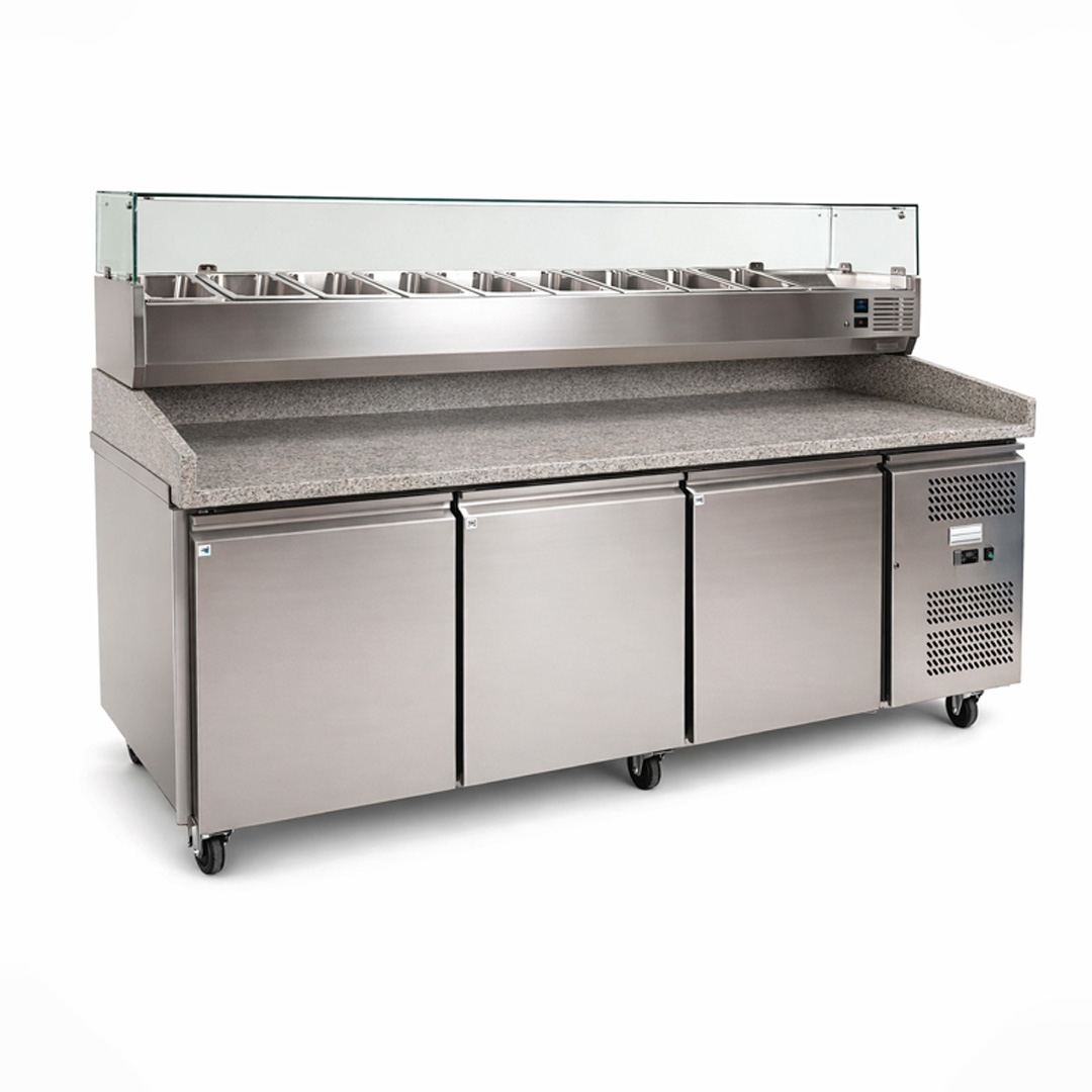 These high-quality pizza prep counters have a granite work surface and refrigerated cupboards to fit either 60 x 40cm shelves or dough trays.
