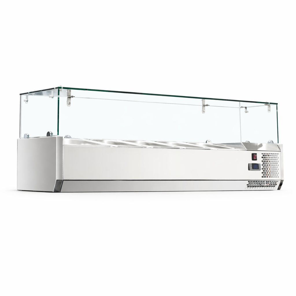 The AA Catering VRX1500/380 Topping Rail Unit is engineered for dependable commercial use, featuring a durable 304 stainless‑steel foamed cabinet and efficient R290 refrigerant cooling. A Carel digital thermostat ensures precise control, maintaining a stable 0–10°C operating range for chilled ingredient storage.